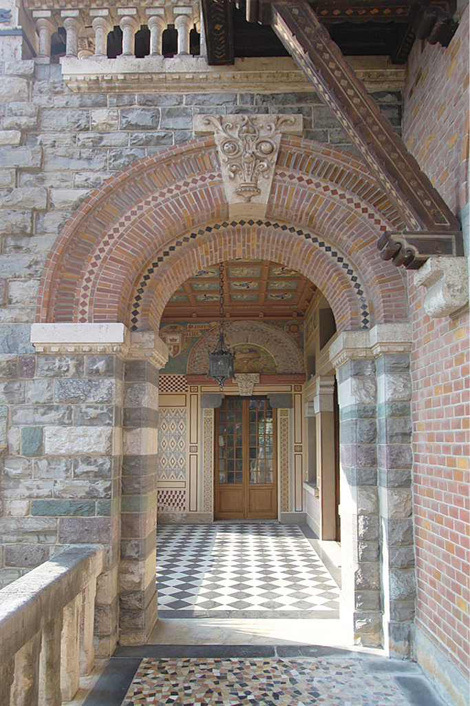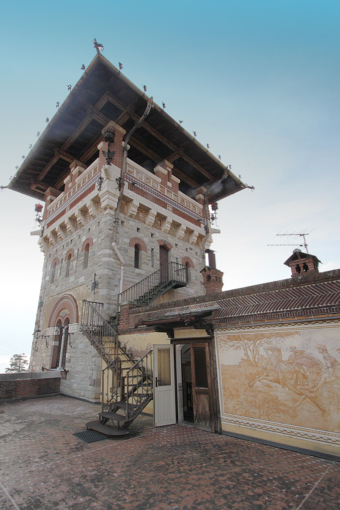 Просторная терраса на крыше, декор с изображением Святого Георгия Победоносца. Дозорная башня с кабинетом хозяина и панорамной площадкой.