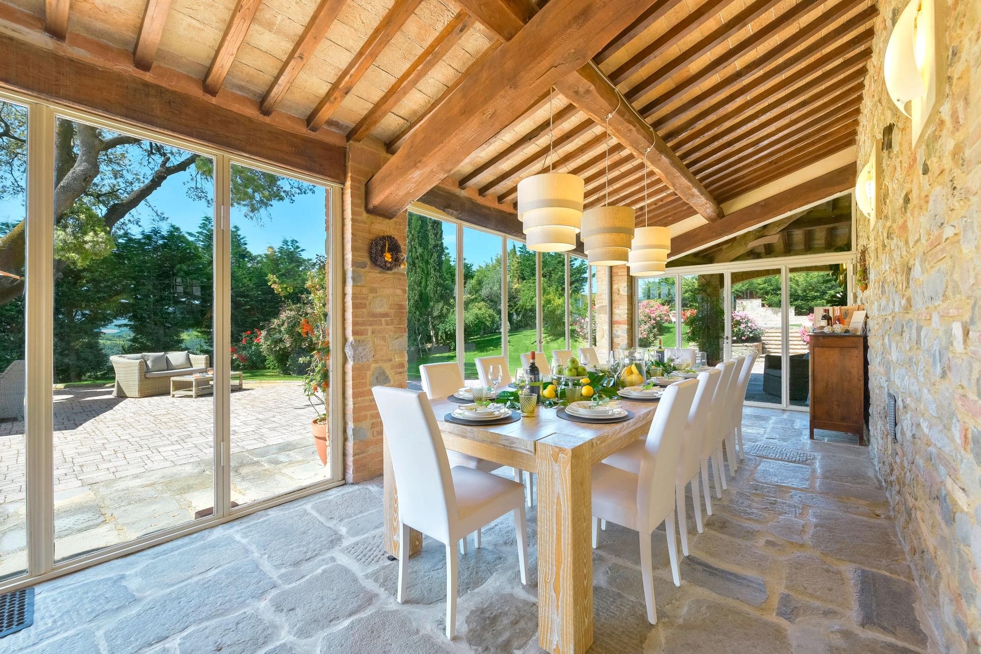 Surrounded by a beautiful private garden (extending for about 25.000 sqm with lawn, century old oaks, olive and fruit trees), Villa Emma has a lovely swimming pool with salt water chlorination (12x6, equipped with gazebo) and several porches (including one provided with barbecue and dining table for 14 people).