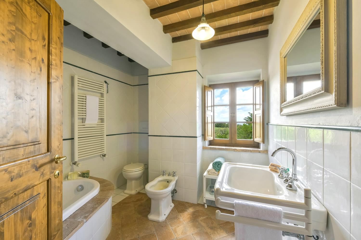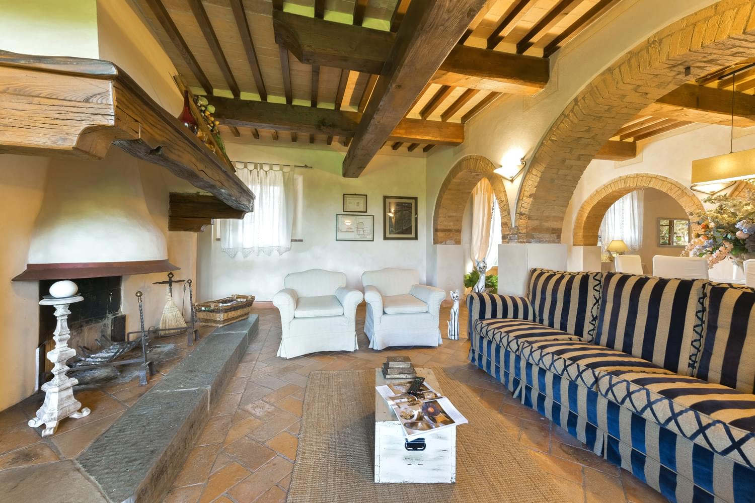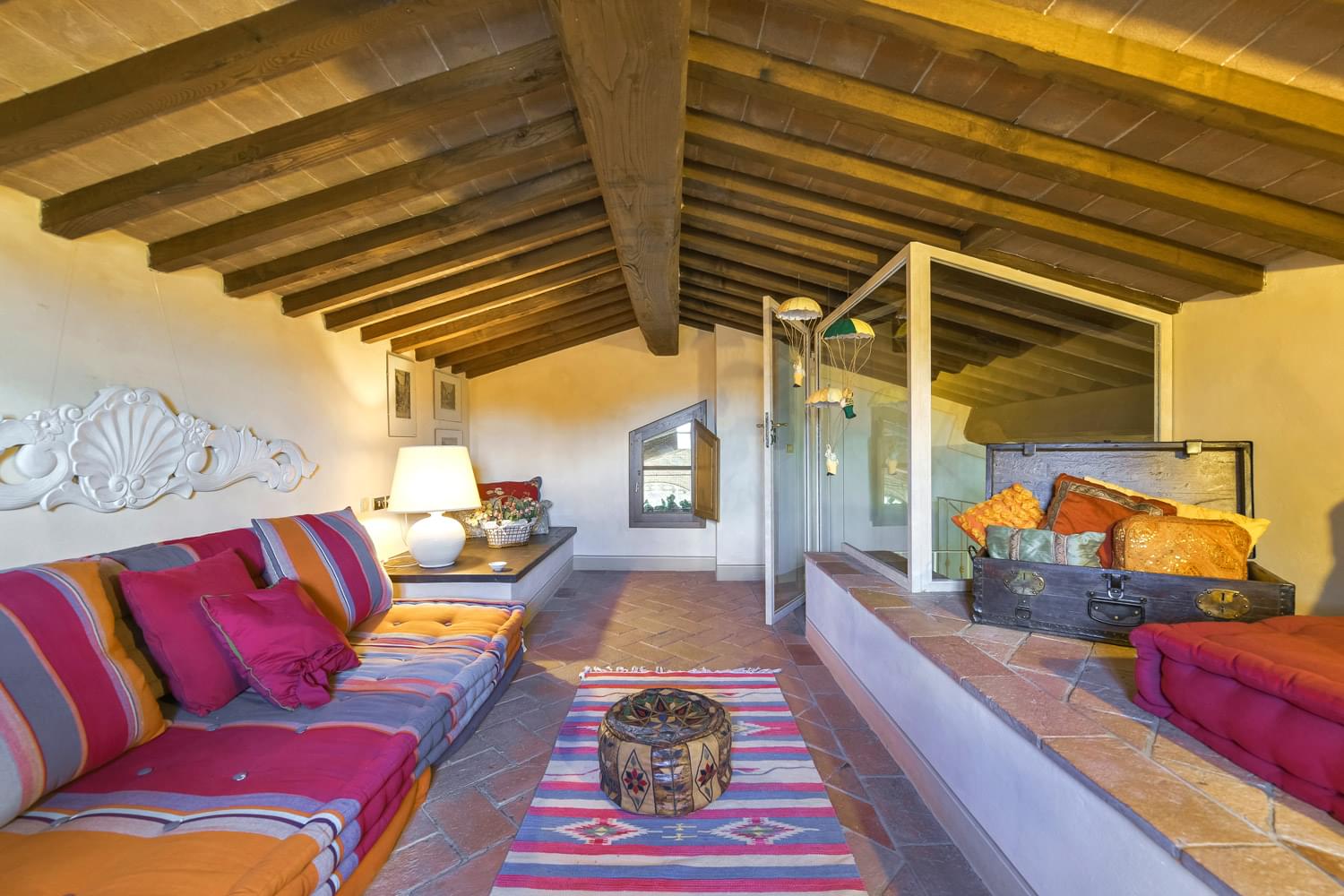 Ground Floor: On the ground floor the villa welcomes you in a fantastic veranda with huge glass walls which make the dining room very bright. The dining room is connected to the big living room which is a real example of Tuscan style architecture with a sequence of brick arch and fire place. A pleasant susrprisa is the kitchen which has been recently renovated in a more modern style, where modern and traditional styles mix perfectly.