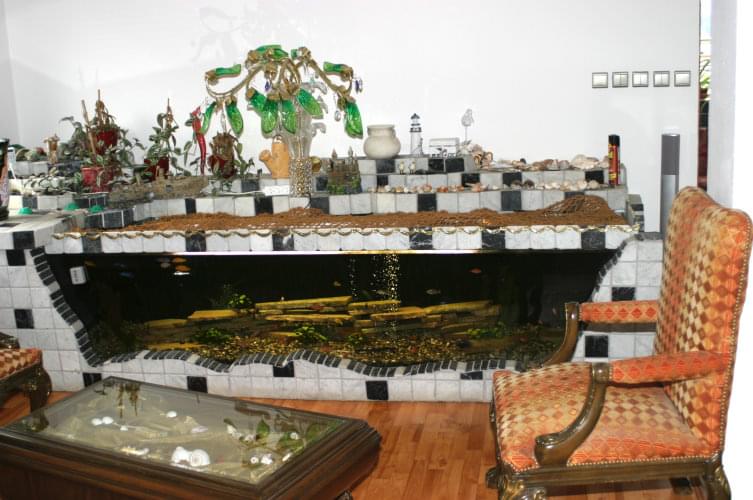 Hier sind zwei der fünf mit Marmor ausgekleideten Gaskamine und ein großes Aquarium installiert.