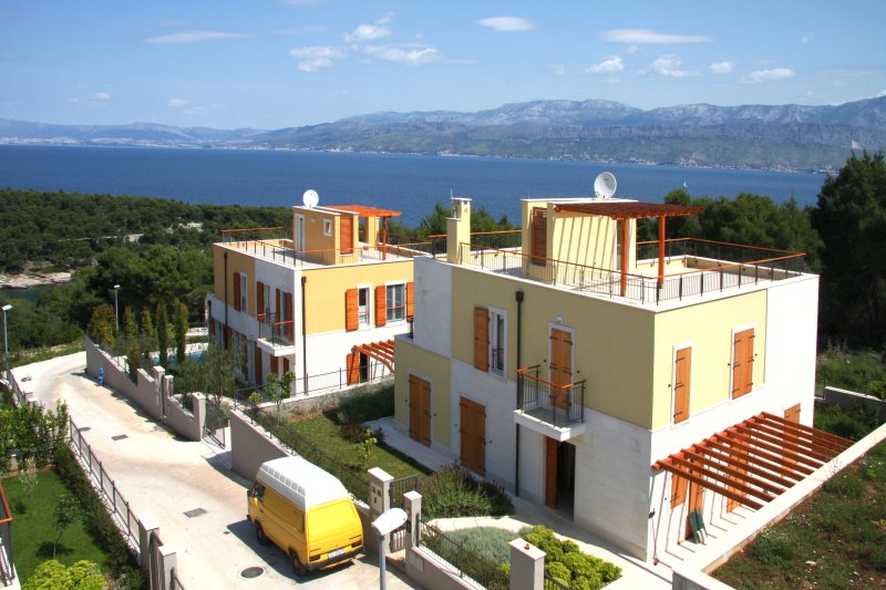 На самом высоком месте в Сплитска на склоне холма находится комплекс вилл с волшебным видом на далматинское море с современной средиземноморской архитектурой под немецко/хорватским руководством. В виллах оснащение высшего качества – каждый дом имеет собственный бассейн – качество изготовления соответствует немецким стандартам. Проект предназначен для покупателей, для которых важны качество и безопасность. Не только бассейн и средиземноморский сад, но и внутренняя отделка дома очень высокого уровня. Некоторые особенности: пластковые окна, средиземноморские каменные полы, открытый камин в гостиной, паркет в спальных, кондиционеры, также подогрев полов во всех ванных комнатах, современная арматура в ванной и высококачественная кухонная техника, большая терраса с деревянной беседкой, ограда с электрическими воротами, 2 автостоянки, фасад с замысловатой архитектурой с цветной штукатуркой и каменной облицовкой.
