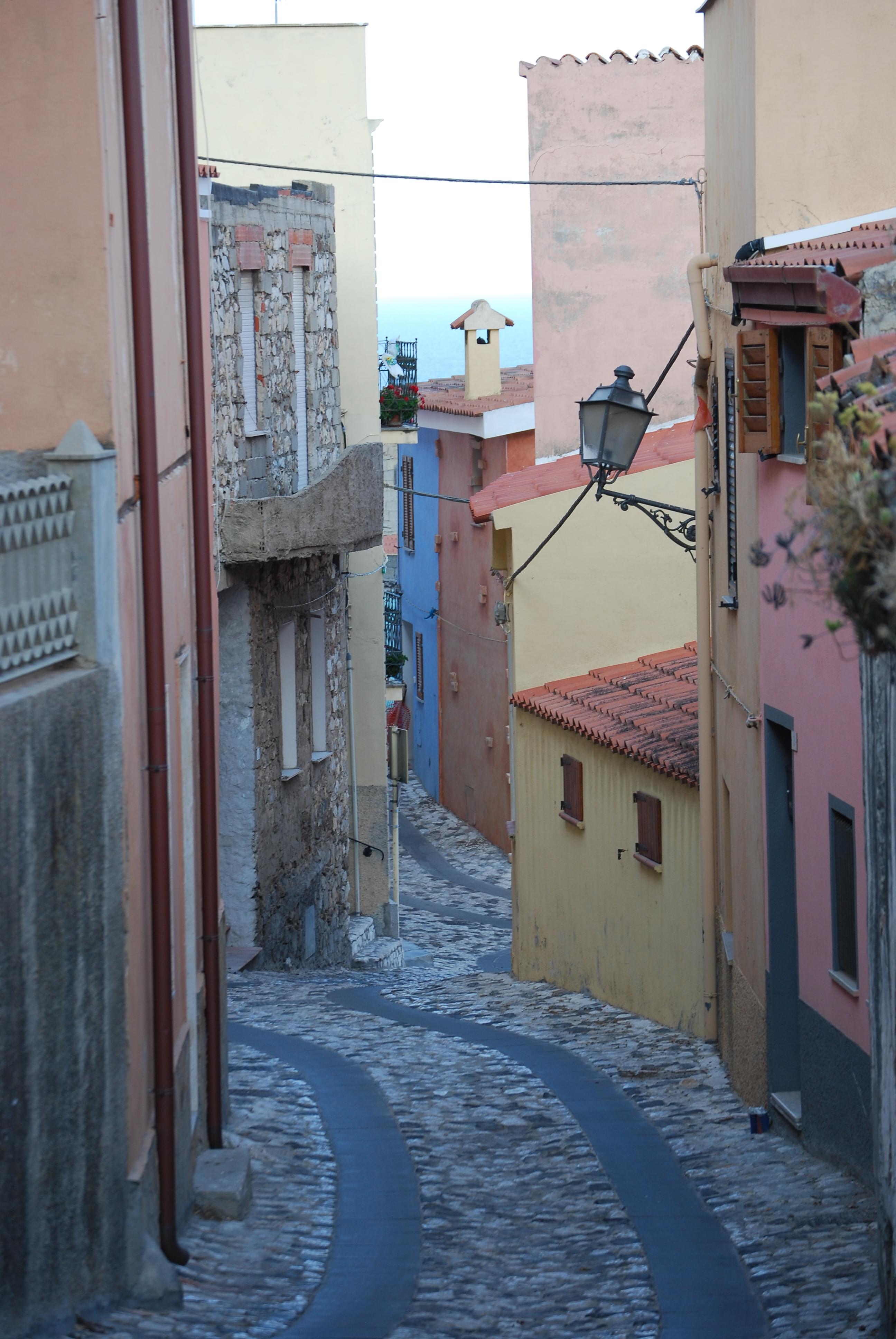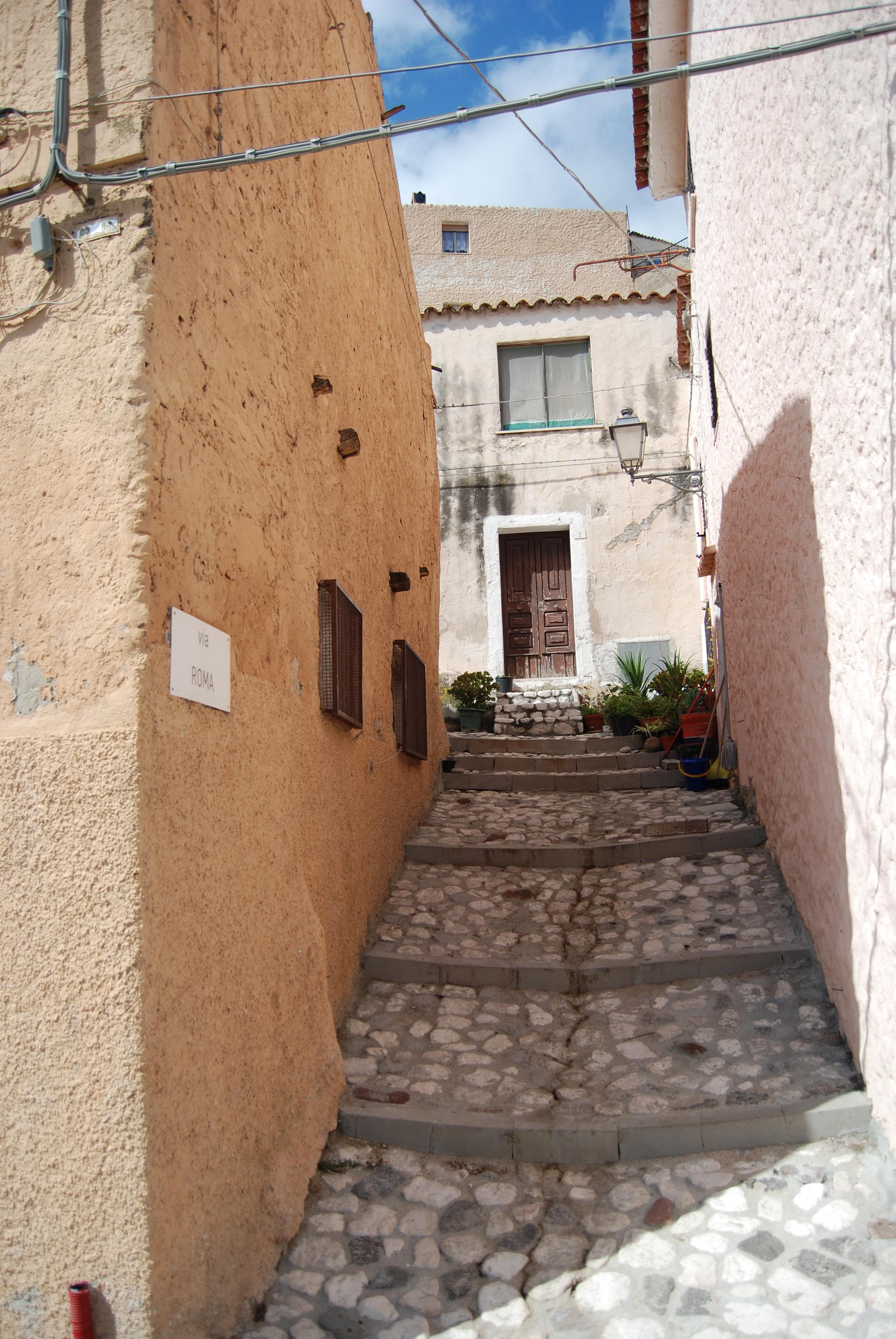 On the upper level there are 2 bedrooms with sea-view and a small terrace with a view of the castle ruin, sea and bordering mountains. The ceilings maintain the typical Sardinian style here, with reed matting between juniper wood beams. The old floor tiling could be saved in both rooms. Similarly, it was decided not to realign any of the walls, everything was newly plastered but the original flowing lines of the walls survived. Plumbing and electrical installations are brand new, all doors and windows throughout the house were replaced; some were even made to measure. For aesthetic reasons real wood window frames and doors were selected. The roof leaked, so was given new insulation and coating. All windows have a built-in insect screen, which can be pulled up and down like blinds. There is satellite TV with German stations, a landline telephone connection for good Internet access, the fireplace has a ventilator to guarantee a soot-free atmosphere even in problematic weather conditions. As the water supply is sometimes limited, a 500 l tank has been installed. “Ange” lies in the middle of the historical part of Posada. Residents can drive their car up to the house, but no through-traffic is permitted.