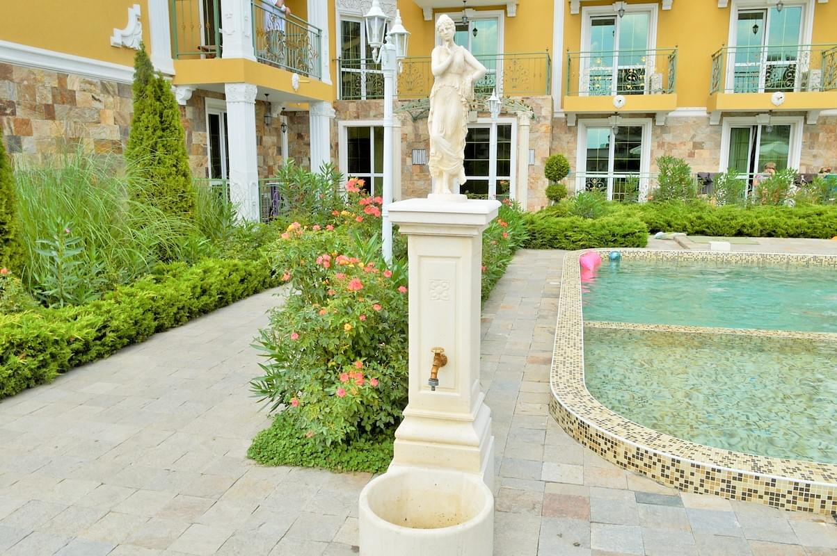 Arco Real Estate offers for sale a spacious two bedroom apartment in an exclusive gated complex on the Bulgarian Black Sea coast in Sunny Beach, built in the exquisite style of the French neoclassical baroque. The complex is the perfect combination of a place for year-round use and a vacation home on the sea. The complex features a maximum functionality, offering all its inhabitants the following amenities: a swimming pool with heating and a children’s section, a beautiful garden, an antique gazebo, a fountain, luxurious elevators and romantic night lighting that highlights the architectural style of the project and the elite status of the complex.