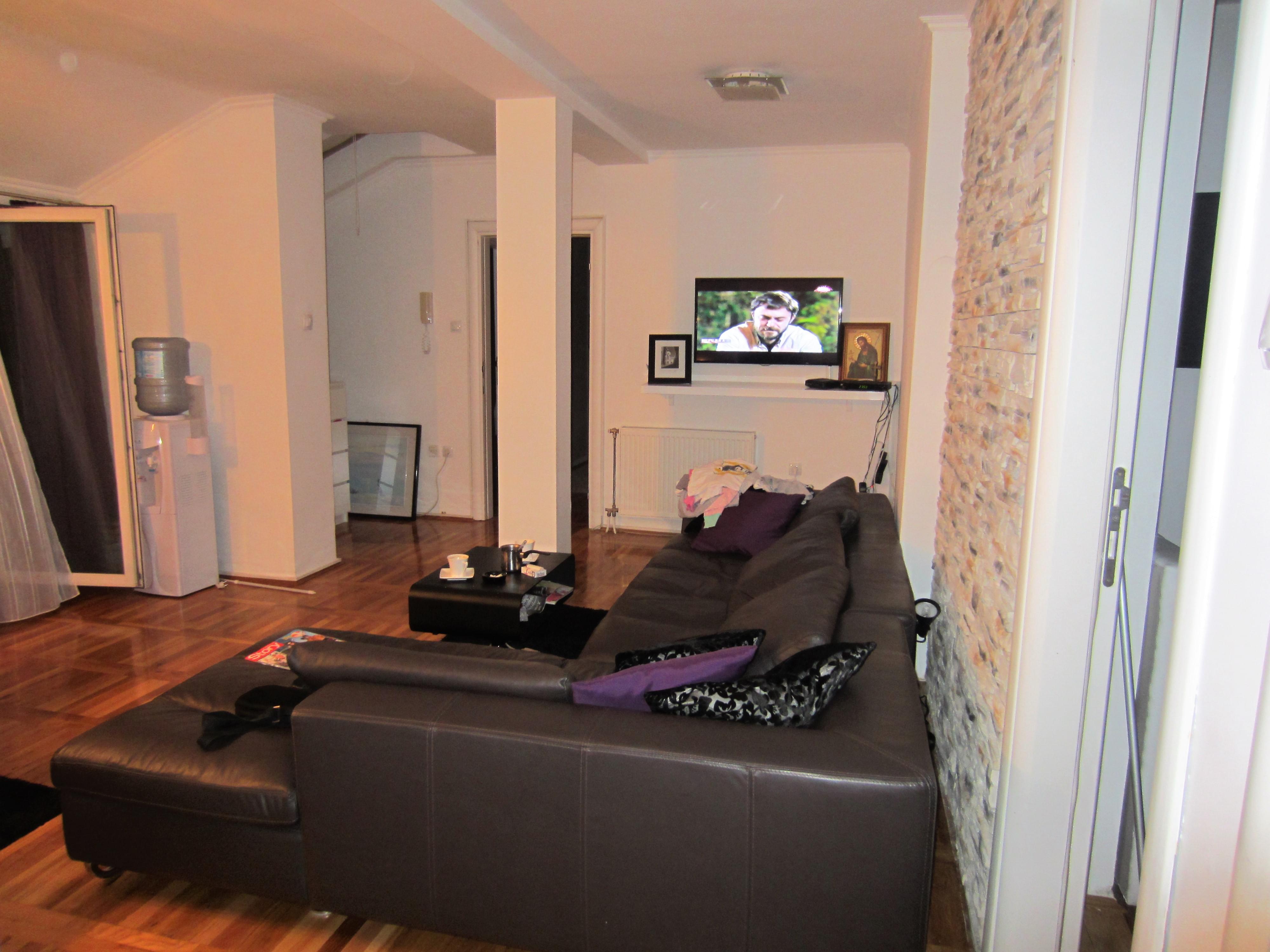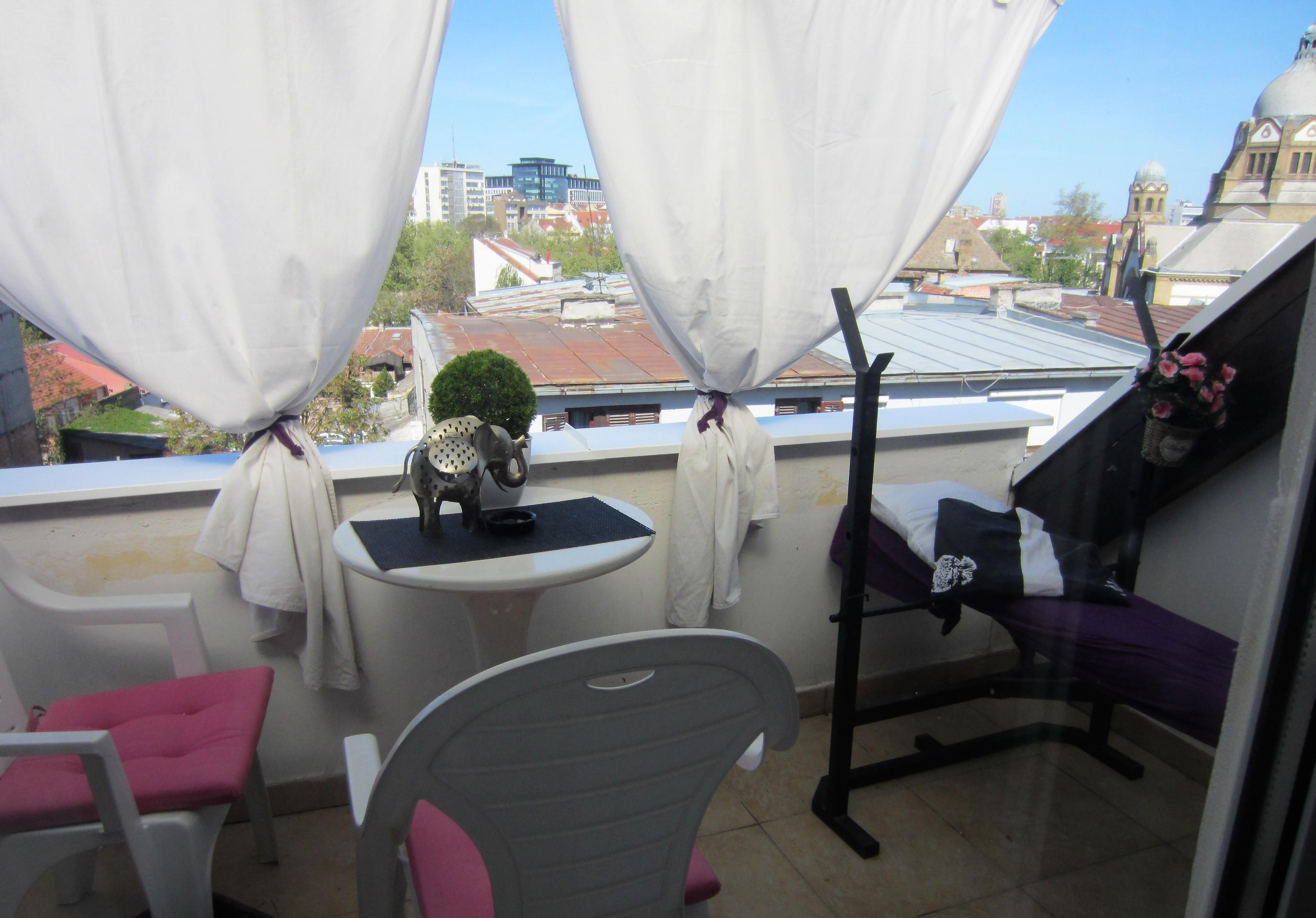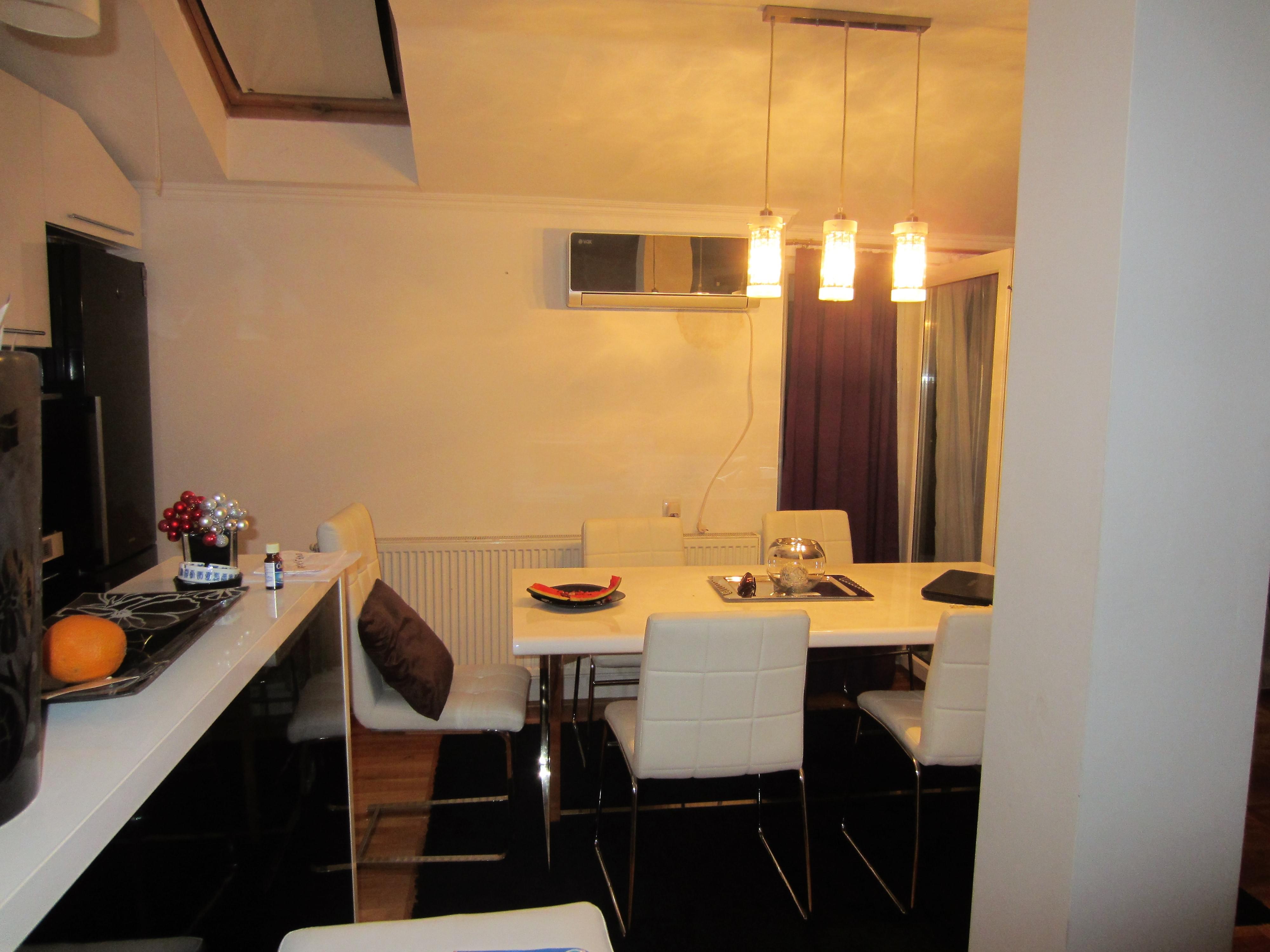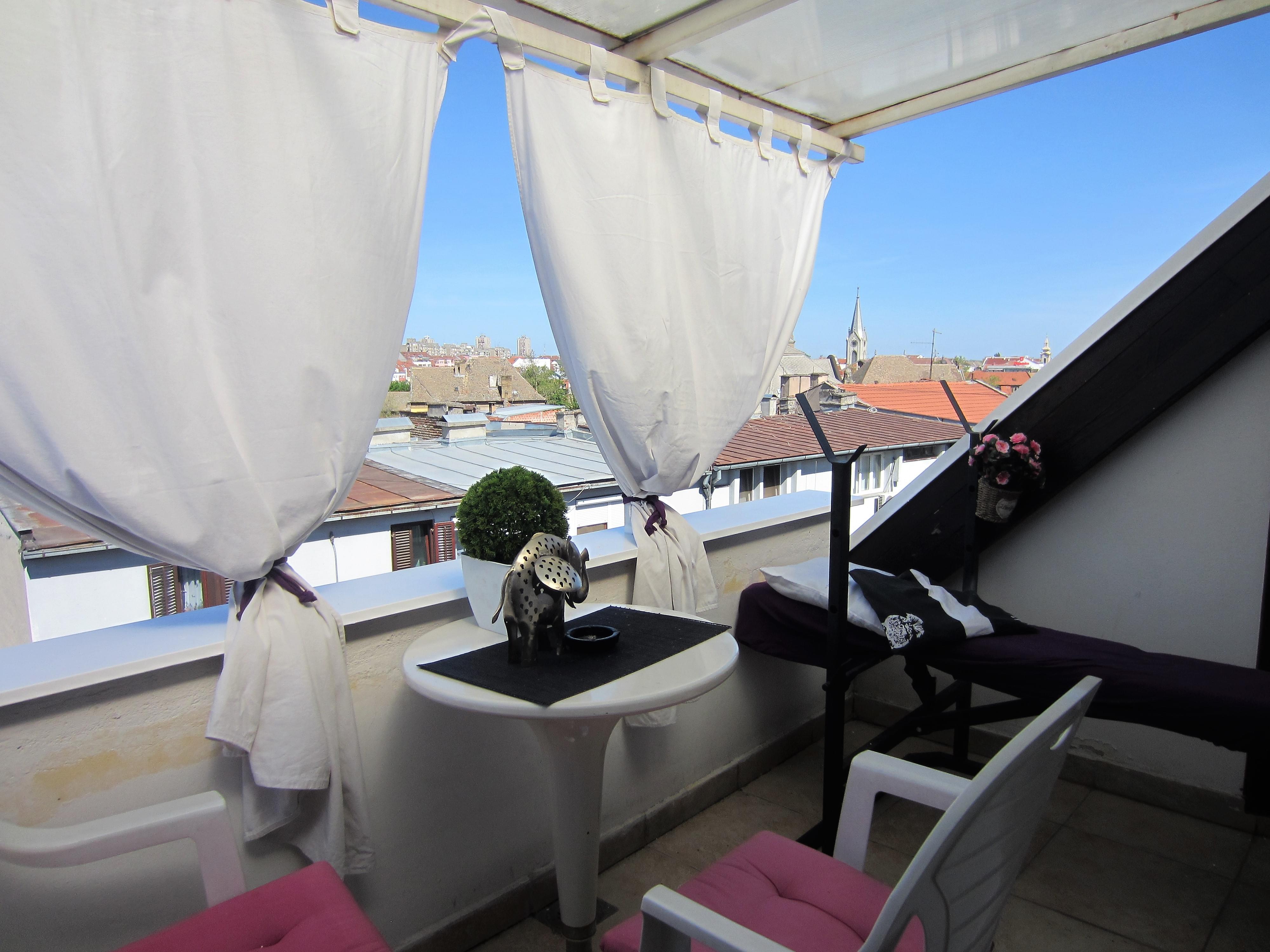 Fully furbished duplex apartment in the centre of Novi Sad, Serbia. The apartment features a large three-bedroom apartment with spacious living and dining area, one bathroom and one WC on the upper level; as well as a studio apartment with a bathroom on the lower level. Private access to the lower level (studio apartment, roughly 30 square meters), which thus may be used separately as well. Both levels are fully furbished (featuring one kitchen each with excellent amenities) and ready to move in, with air-conditioning and heating included. The space features stylish interior design and quality materials (wooden floors, quality furniture). In addition, the upper level features a large corridor with additional storage room that may be utilised as a closet in addition to those available in each bedroom. Furthermore, the upper level terrace includes two additional storage compartments, 7 and 3 meters long, respectively. The terrace features a lovely view at the city centre and Synagogue. High ceilings, with the lowest point at the terrace exit reaching 2 meters of height.