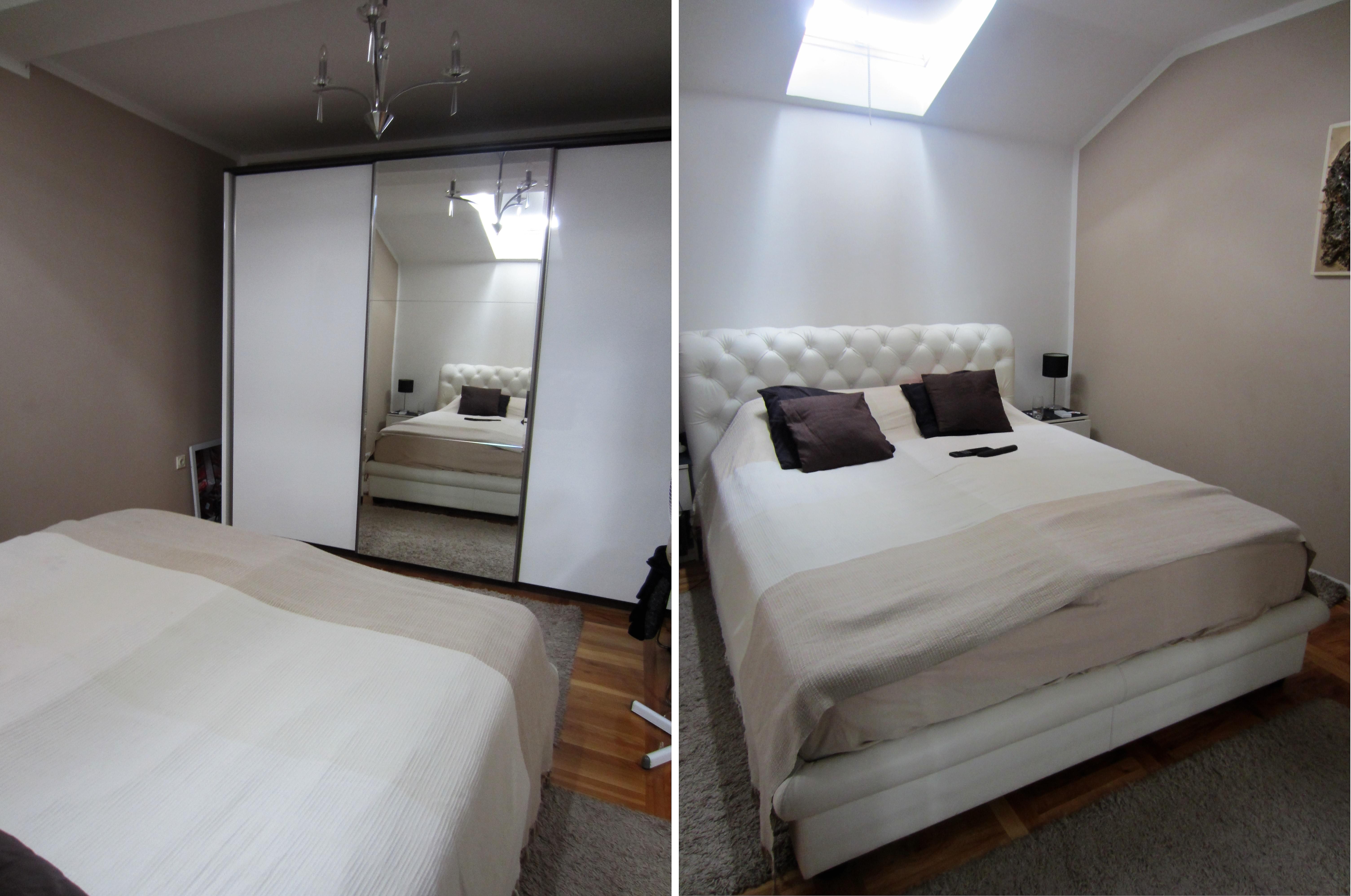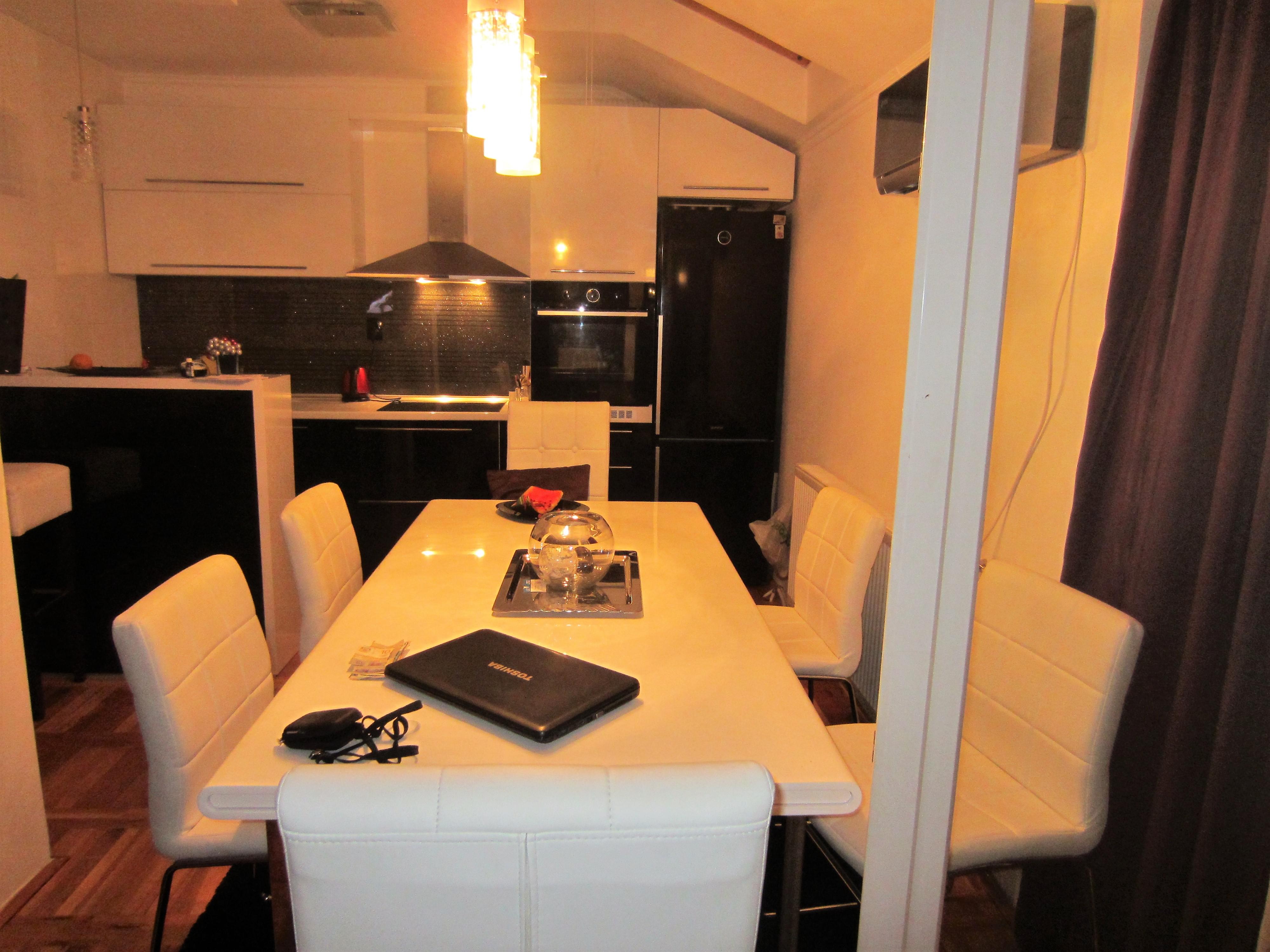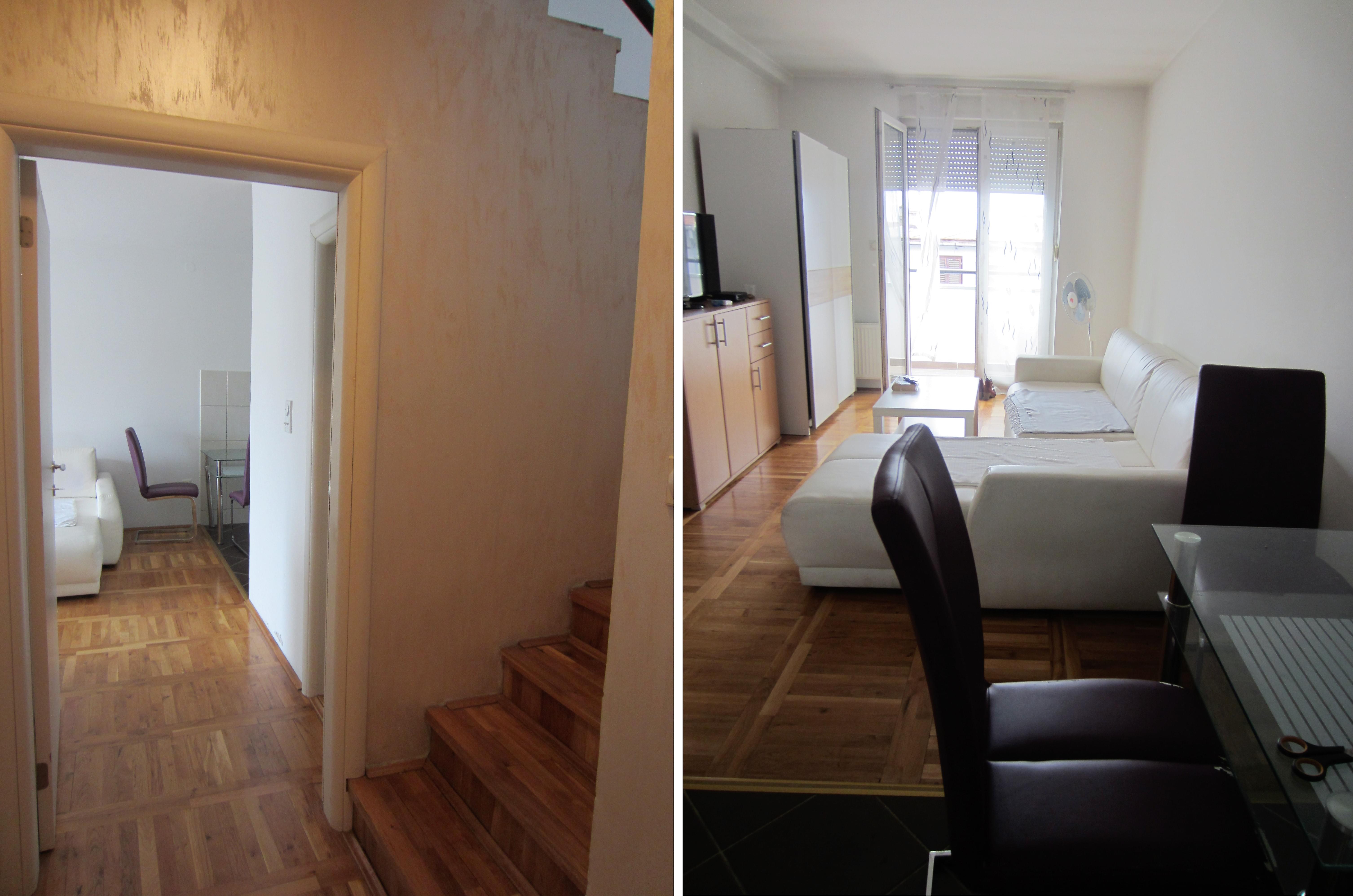 Fully furbished duplex apartment in the centre of Novi Sad, Serbia. The apartment features a large three-bedroom apartment with spacious living and dining area, one bathroom and one WC on the upper level; as well as a studio apartment with a bathroom on the lower level. Private access to the lower level (studio apartment, roughly 30 square meters), which thus may be used separately as well. Both levels are fully furbished (featuring one kitchen each with excellent amenities) and ready to move in, with air-conditioning and heating included. The space features stylish interior design and quality materials (wooden floors, quality furniture). In addition, the upper level features a large corridor with additional storage room that may be utilised as a closet in addition to those available in each bedroom. Furthermore, the upper level terrace includes two additional storage compartments, 7 and 3 meters long, respectively. The terrace features a lovely view at the city centre and Synagogue. High ceilings, with the lowest point at the terrace exit reaching 2 meters of height.