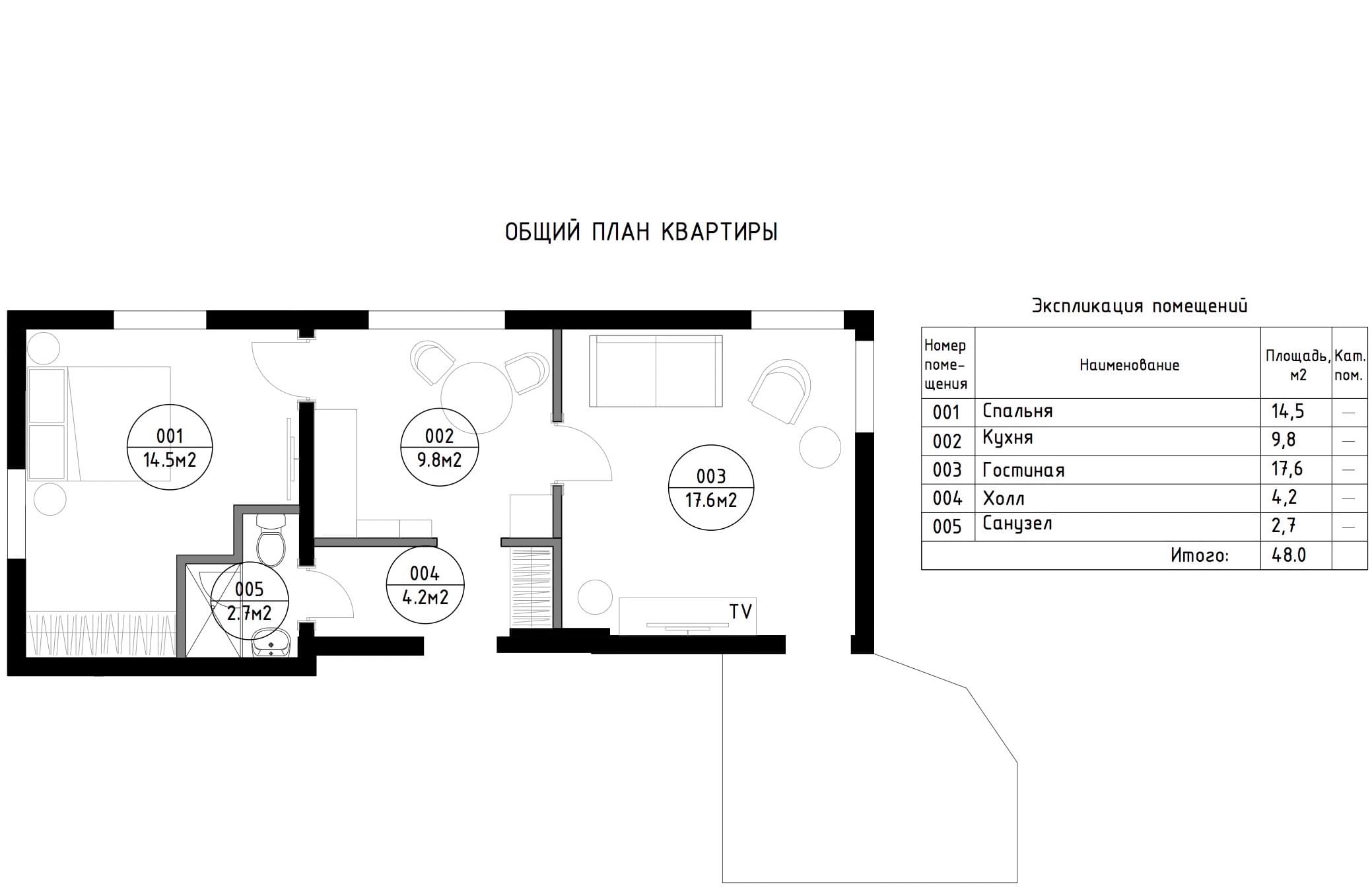 Floor plan: kitchen 9.8 sq. m, living room 17.6 sq. m, bedroom 14.5 sq. m, bathroom with shower 2.7 sq. m, entrance hall, outdoor terrace 16 sq. m.