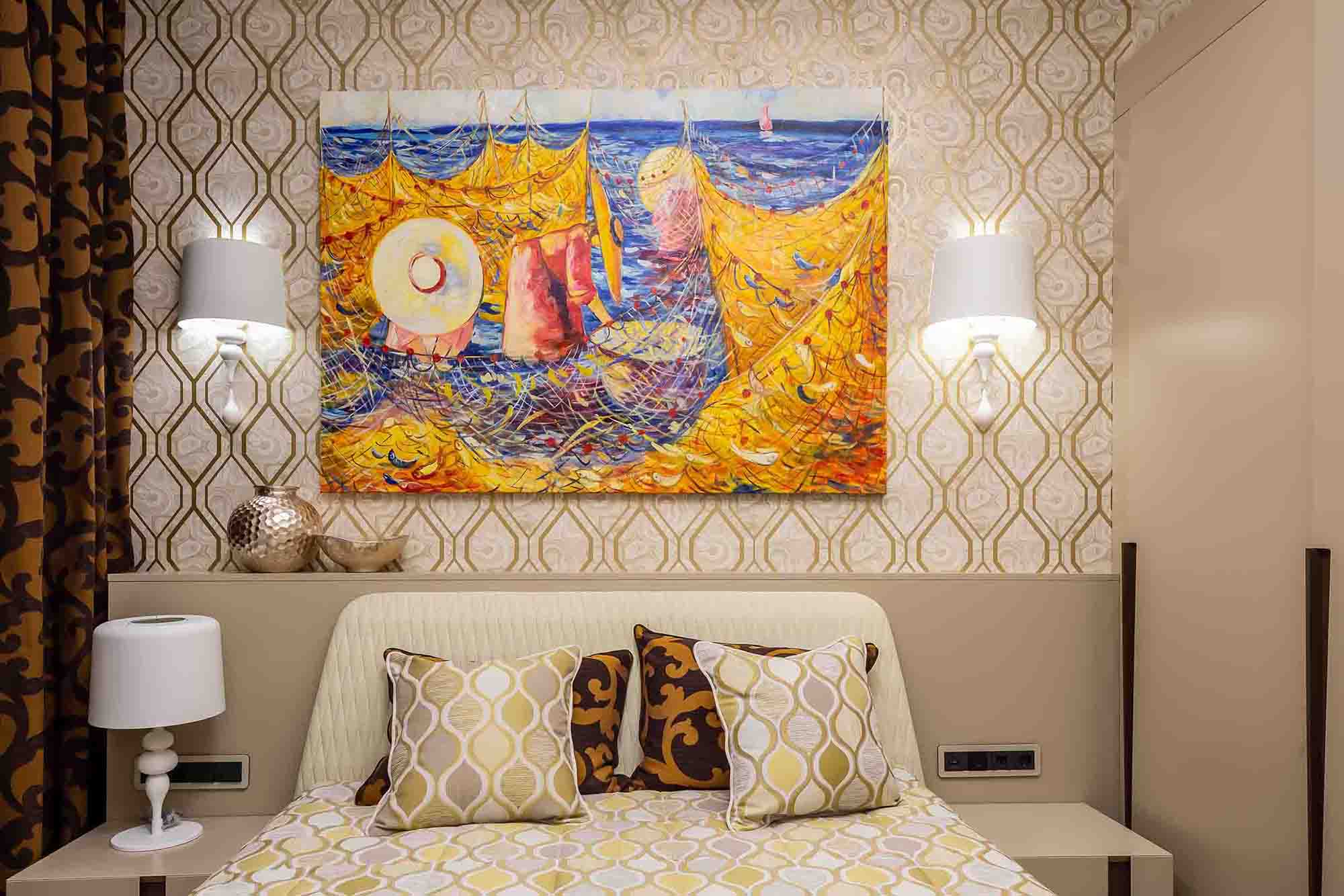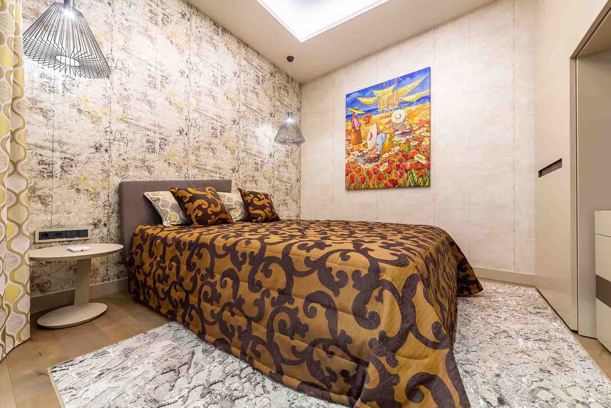 Хозяйская спальня: Полы паркетные фабрики MARDEGAN из натурального дерева. кровать, прикроватные тумбочки, туалетный столик и встроенный шкаф производства PRESOTTO (Италия). Подразумевалось разделение шкафа на мужскую и женскую половины. В каждой половине свои отделения для вещей, полки, выдвижные ящики со стеклом. Двери раздвижные с доводчиками. Выдвижными ящики туалетного столика отделаны изнутри чёрным бархатом, что сохранит от повреждения украшения хозяйки. Ковёр из бамбукового шёлка производства SIT UР (Италия).