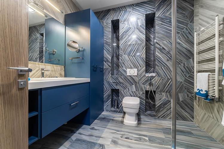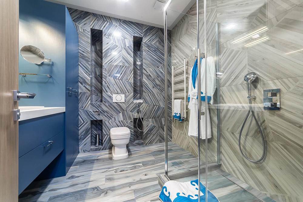 Санузел. На полу и стенах краски моря на керамограните LA FABBRIKA (Италия) слились со струями воды из смесителей фабрикиCRISTINA. Унитаз из новейшей коллекции производителя сантехнического оборудования SIMAS (Италия). Душевая кабина выполнена по супертехнологии производства стекла специально безопасным для душевых кабин, которые изобрели великие тирольские мастера стекла фабрики DUKA (Италия). Мебель великолепного цвета кобальт выполнена на фабрике ARCOM (Италия) и скрывает за своими дверками бойлер для воды, необходимость которого может возникнуть при перебоях с подачей горячей воды.