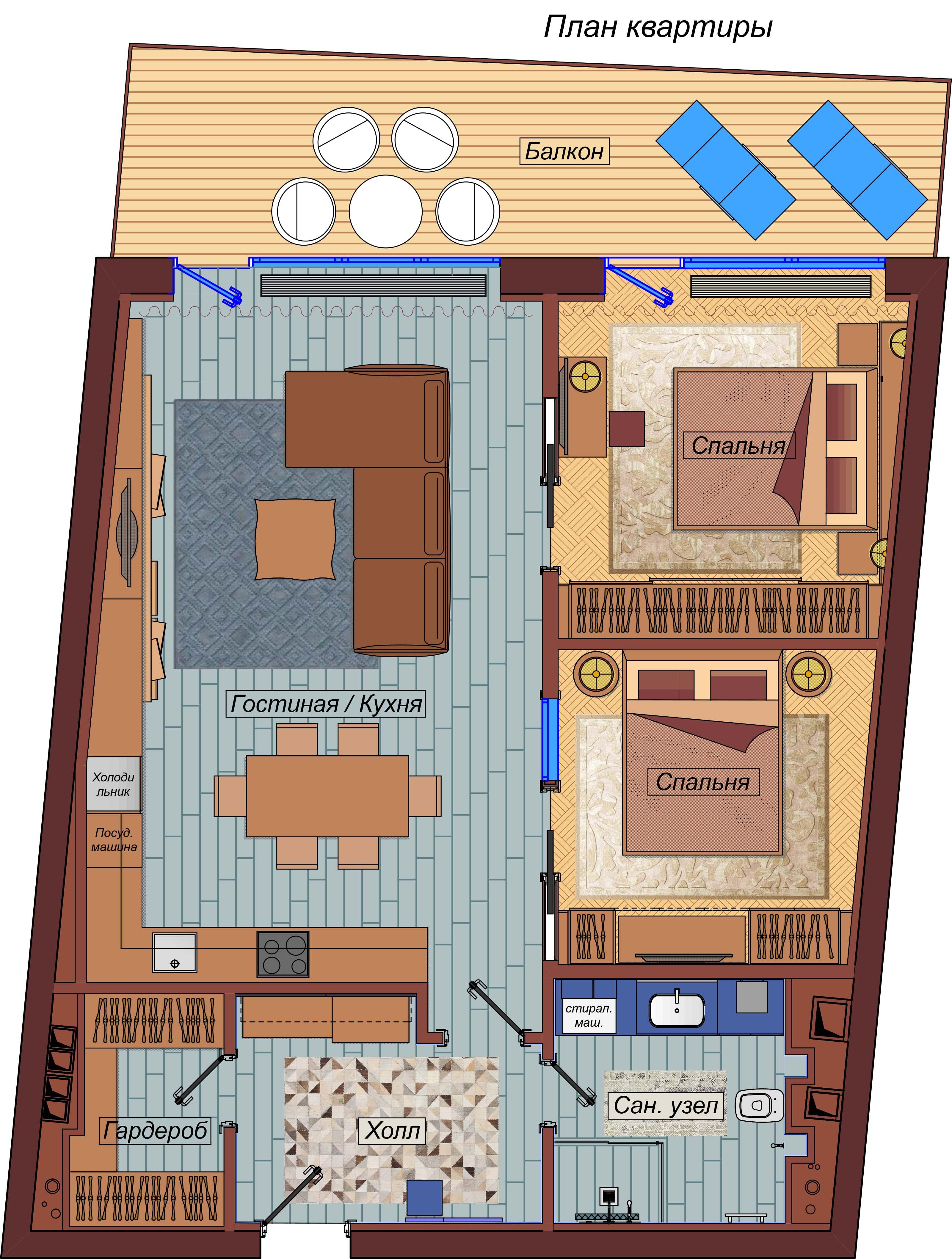 Сам комплекс удостоен высоких международных наград за необычную архитектуру. Но в связи с необычной формой здания в виде громадного корабля, его сужение к носу, придало всем внутренним помещениям трапециевидную форму. Планировочное решение уникально тем, что архитекторы добились того,что каждое помещение в апартаментах имеет правильную прямоугольную форму. Стилистика апартаментов абсолютно соответствует стилистике здания “Актер Гелэкси”.