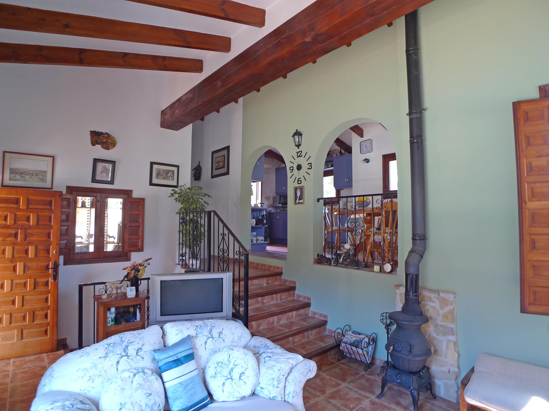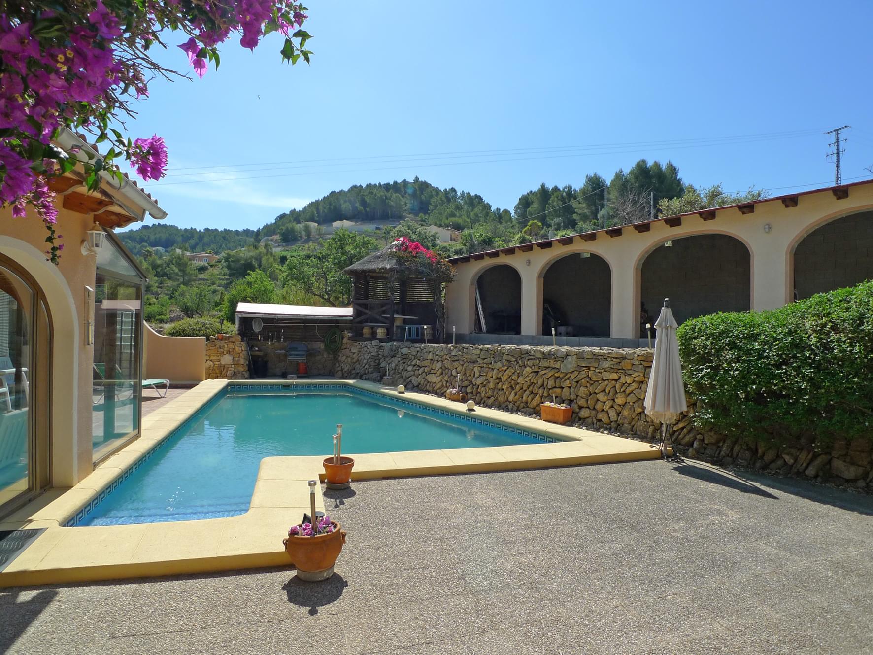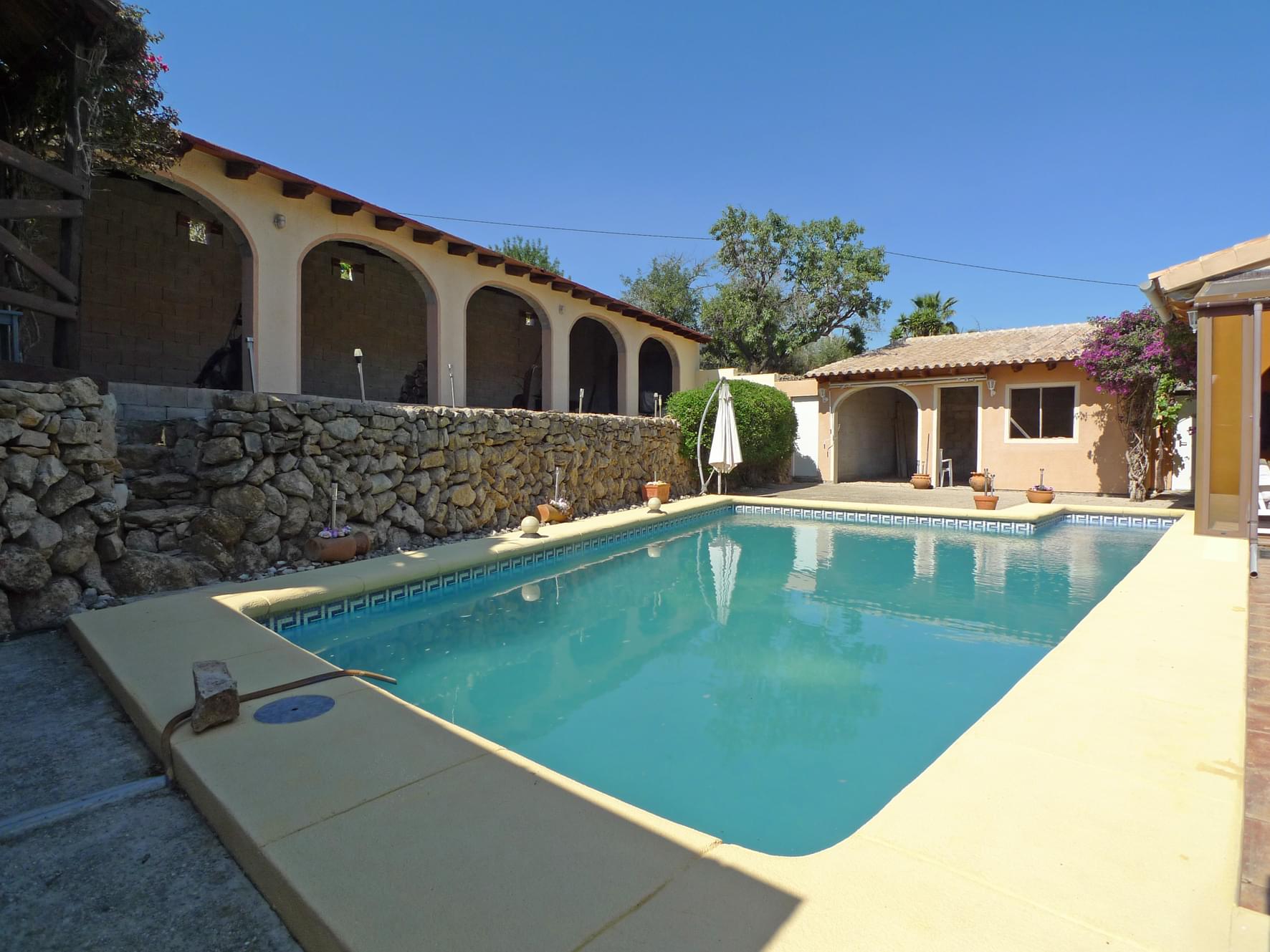 Charming detached villa with stunning views, set on a large plot with 2 floors and built by the current owners. When you arrive at the main area of the property you can see that the property has been built around the pool area, giving the outside area a great terraced feel. The main living - dining room has a glazed porch with large sliding doors that can be opened so that the winter sun can reach the interior of the house. It has a wood burning stove and a beautiful atrium with a well maintained jacuzzi. From here you have access to another room, also with a wood burning stove, wooden beams and views of the pool. A few steps lead to a large American style kitchen with dining area and access to an open naya, ideal for breakfasts in the summer months with beautiful views. On the same level there is a spacious master bedroom with fitted wardrobes, air conditioning and en-suite bathroom. An internal staircase leads to two further bedrooms, all with fitted wardrobes and fans. There is also a large bathroom in this area. The outside area has a covered summer kitchen, a bathroom, a covered BBQ area, a wooden pergola, a large 12m x 50m Riu Rau which is a blank canvas and a second large 19m x 13m unit which could be converted into a habitable area. All of the above is located around the pool. It also has a large storage area where the pool pump is located, a large garage which has been converted into a large workshop, ideal for someone with hobbies and another pergola. You have to see it to discover the endless possibilities possible in this property.