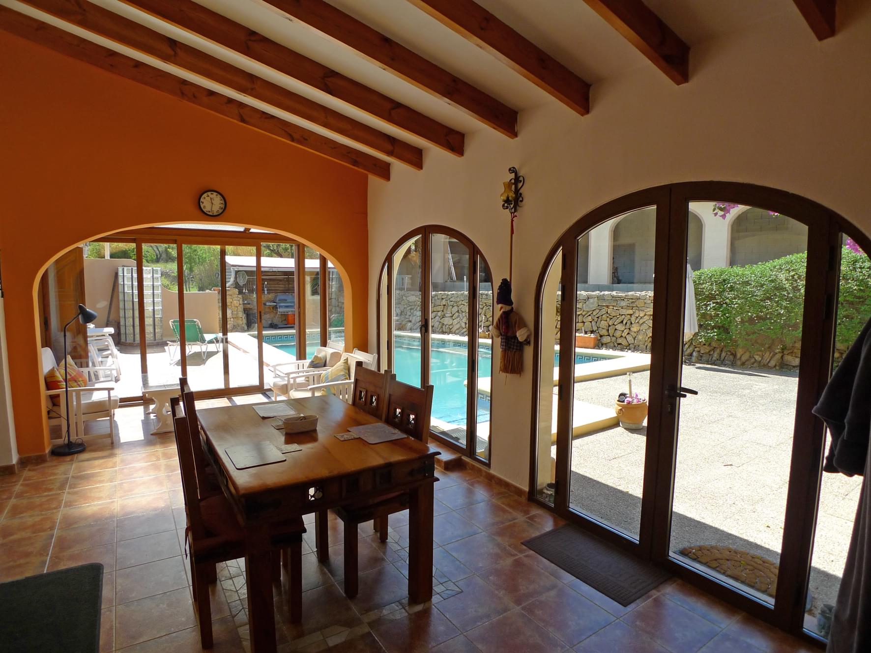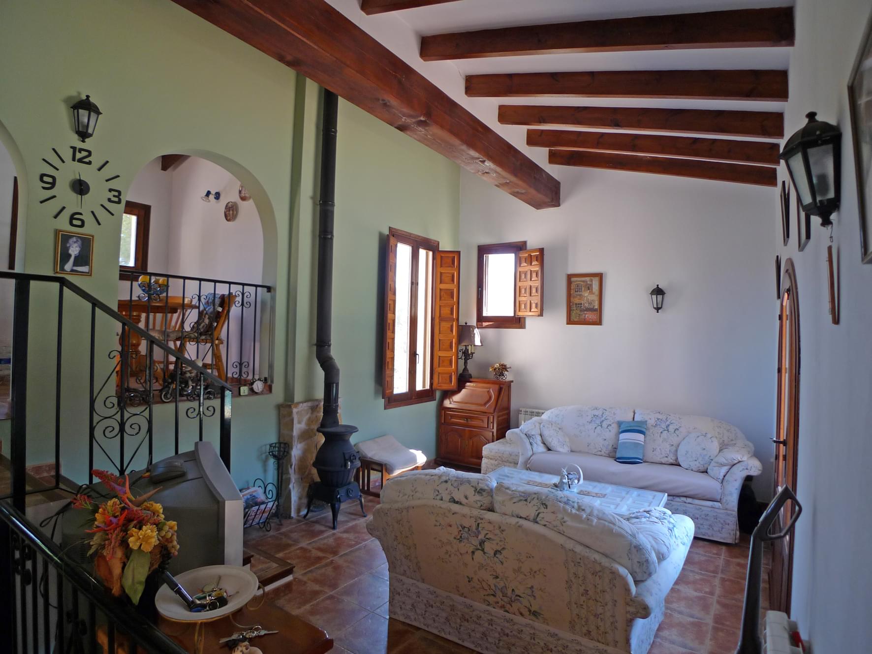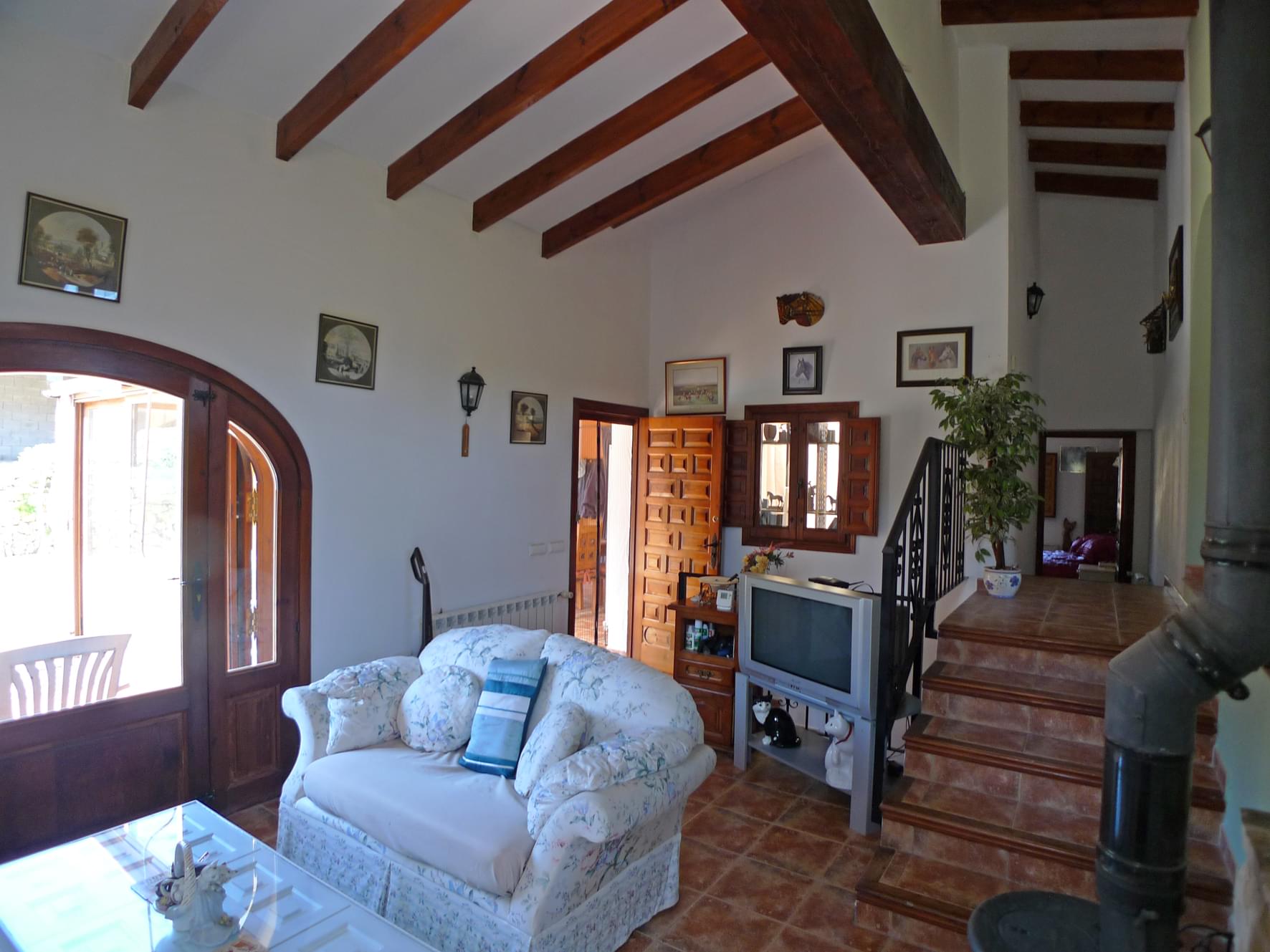 Charming detached villa with stunning views, set on a large plot with 2 floors and built by the current owners. When you arrive at the main area of the property you can see that the property has been built around the pool area, giving the outside area a great terraced feel. The main living - dining room has a glazed porch with large sliding doors that can be opened so that the winter sun can reach the interior of the house. It has a wood burning stove and a beautiful atrium with a well maintained jacuzzi. From here you have access to another room, also with a wood burning stove, wooden beams and views of the pool. A few steps lead to a large American style kitchen with dining area and access to an open naya, ideal for breakfasts in the summer months with beautiful views. On the same level there is a spacious master bedroom with fitted wardrobes, air conditioning and en-suite bathroom. An internal staircase leads to two further bedrooms, all with fitted wardrobes and fans. There is also a large bathroom in this area. The outside area has a covered summer kitchen, a bathroom, a covered BBQ area, a wooden pergola, a large 12m x 50m Riu Rau which is a blank canvas and a second large 19m x 13m unit which could be converted into a habitable area. All of the above is located around the pool. It also has a large storage area where the pool pump is located, a large garage which has been converted into a large workshop, ideal for someone with hobbies and another pergola. You have to see it to discover the endless possibilities possible in this property.
