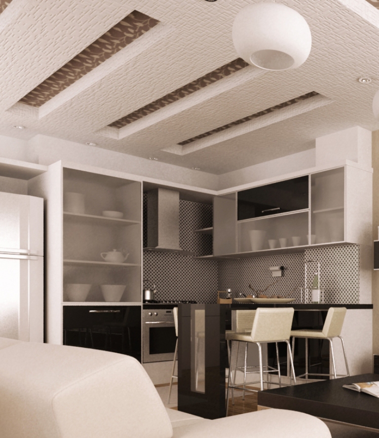 • Потолки – шпаклевка, сверху покраска + подвесные потолки со встроенным точечным освещением;