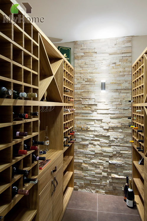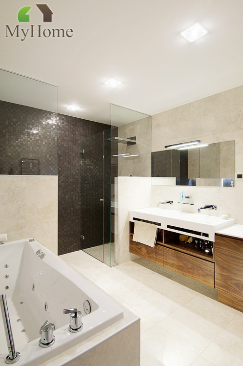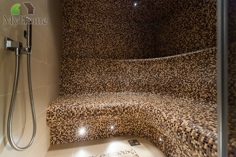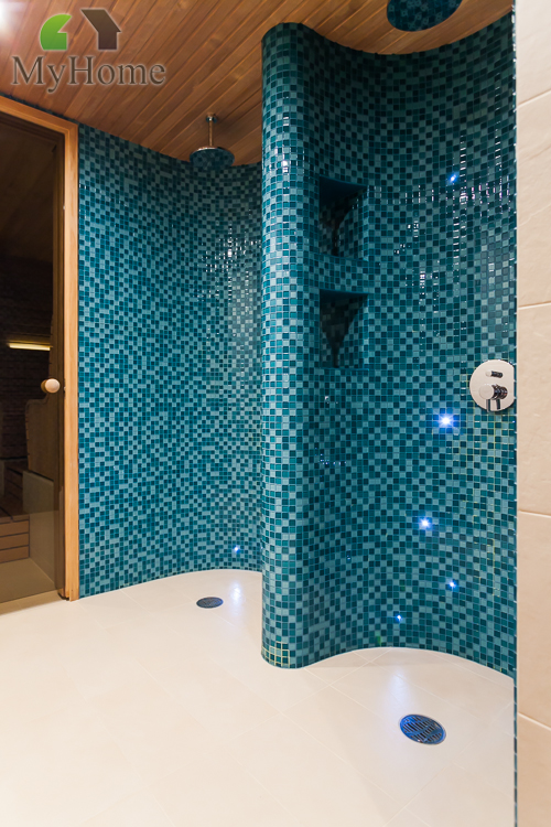The interior of the whole house is designed with natural materials, from stone to wood; colours are warm and tranquil, giving a slightly oriental impression. The floor on the ground floor is covered with beautiful and practical engraved marble that is easy to clean, leaving no traces on its surface. Thanks to floor heating, the stone does not feel cold under one’s feet. The floors of other rooms are covered with parquet flooring (American walnut). A wood-burning fireplace gives a sense of comfort to the living room; the long stone fireplace shelf gives the impression of luxury. The whole house is decorated with an exotic pattern fragment that can be found on carved wooden closet doors (intarsia technique), engraved into the glass and metal surfaces, and in the plastered rear wall of the restroom on the spa floor; this motif is inspired by the Russian scarf. The basement of the house is as well-lighted as the two floors above, thanks to the architect’s inventive solution to make use of the hollow caused by the ramp by installing floor to ceiling windows. The emphasis of the home spa interior is put on the ceiling and lighting. Although the sauna is heated with electricity, its stones (200 kg) give the same effect as that of a wood-burning sauna heater. A heated ramp leads to the garage. One car can be parked in the garage and there is enough room for storing gardening tools inside. At least two more cars can be parked in the fenced yard.