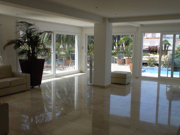 Вилла в Эмпуриабрава, Испания, Коста Брава с прямым выходом на канал! Участок - 350м2, жилая площадь - 350м2, спален - 5, ванных комнат - 3, салон-столовая, гараж - 1, мест для паркинга - 1, причал - 20м, также есть бассейн, подогрев пола, кондиционер, сигнализация, камин, ремонт 2009г.