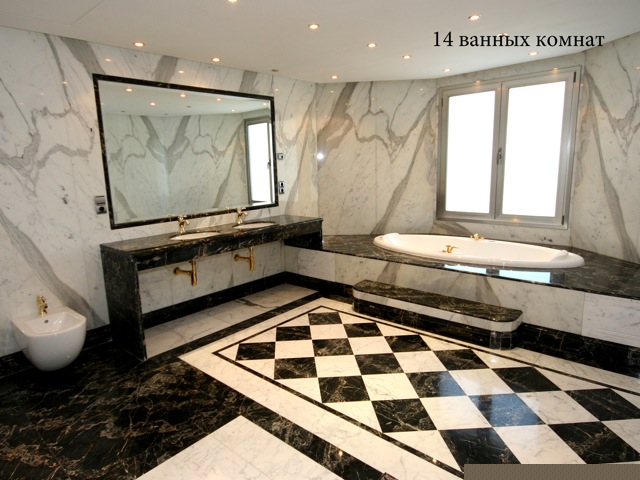 Зоны: 3 этажа, 9 спален, 14 ванных комнат, кухня, салон, столовая, спа, дискотека, спортзал, хаммам, гардеробные комнаты, хохяйственная комната, 2 бассейна, контроль безопасности на улице 24 часа