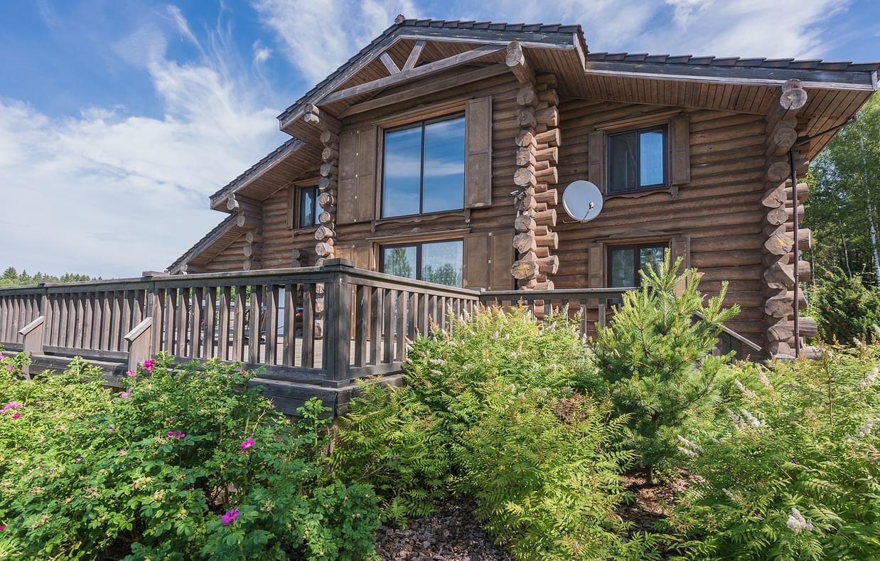 This is a wooden Russian-style cottage in a quiet, beautifully arranged place near the lake, in the middle of a pine forest.
