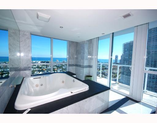 Квартира с панорамными видами на 42-м этаже, расположена в Майами в кондоминиуме Quantum On The Bay; современный дизайн, гостиная, 2 спальни, ванная комната, открытый балкон с видами на залив, пол из итальянской плитки, открытая кухня с кварцевой сто...