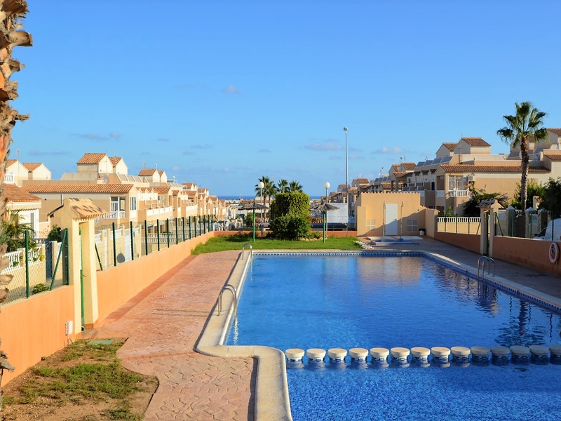 Semi-detached corner house for sale in Torrevieja, in the urbanization of Senuela, on the edge of Orihuela Costa. The house has 70 square meters of a living area distributed between the living room with an open kitchen, a laundry room, two bedrooms a...