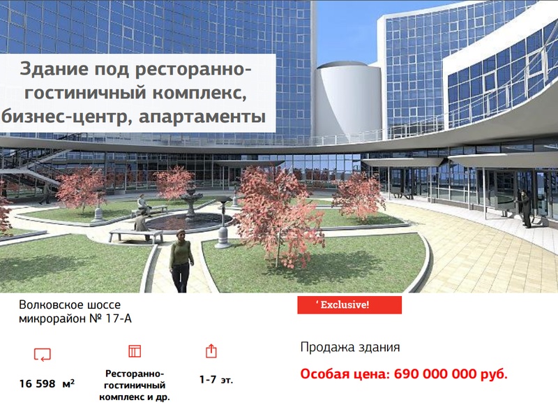 For sale is a building for a restaurant and hotel complex, business center, apartments. The general composition of the complex is a group of several buildings, united by a single one-story stylobate, in which the entrances into all buildings (hotel, ...