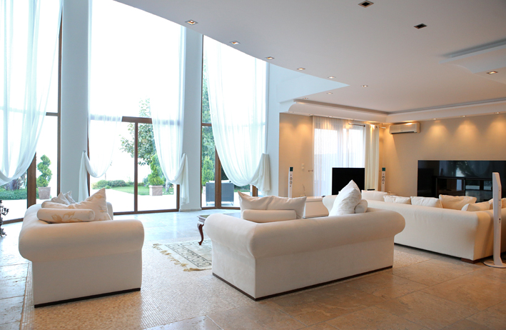 Three floored furnished villa in Chalkidiki is 80 km from the airport "Macedonia" and is 90 km from Thessaloniki city.It is a very calm place surrounded by pine trees and greenery. It is 10 m from the sea and has a big yard with alcoves and chaise-lo...
